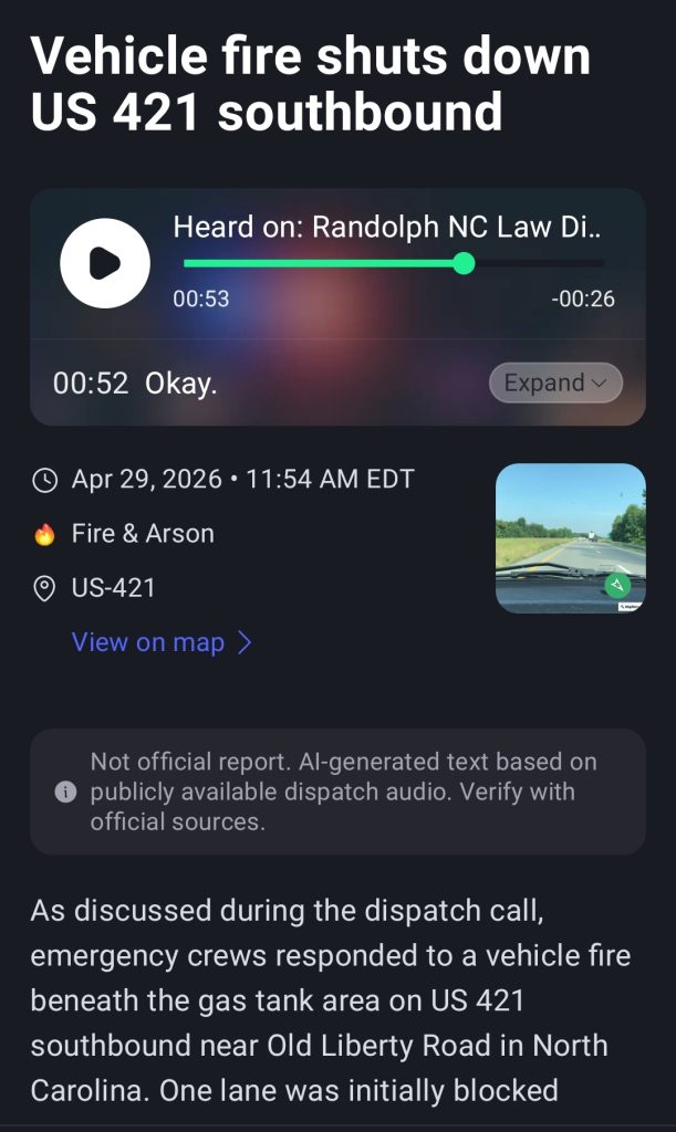 But that AI frequently has accuracy issues. Earlier this month, several residents submitted news tips to Acme News for a homicide reported by the app somewhere in the Archdale area. When reporters pulled up the dispatch audio inside the app, it referenced ‘signal 50,’ a radio code in Randolph County used to indicate that an incident is under control. The app had seemingly classified that code as a homicide.