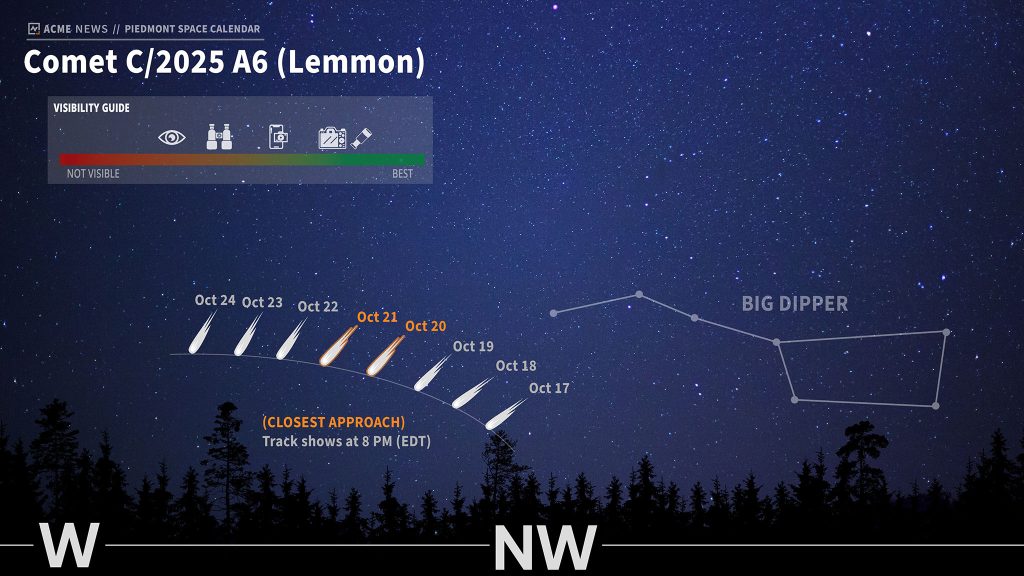 For Piedmont observers, both comets will appear in the western sky shortly after sunset. On Oct. 20–21, sunset will occur around 6:35 p.m., with the best viewing between 7:30 and 9:30 p.m.