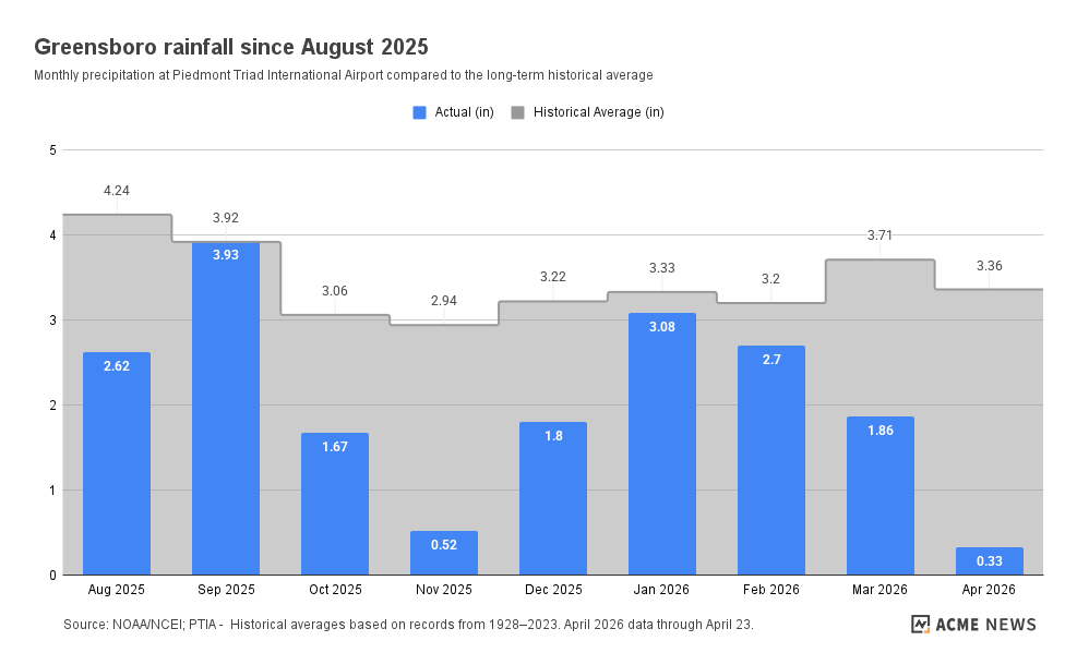 Rainfall deficits have grown to more than 12 inches across nearly the entire state since last August, with many areas receiving barely half their normal precipitation. Raleigh’s shortfall since mid-August stands at more than 16 inches, surpassing its worst deficit during the historic 2007 drought. Scientists and forecasters estimate that most of North Carolina needs 10 inches of rain or more to recover. April is on pace to be the warmest on record in Asheville, Charlotte and Raleigh, and one of the top-ten driest, with less than an inch of rain in most areas.