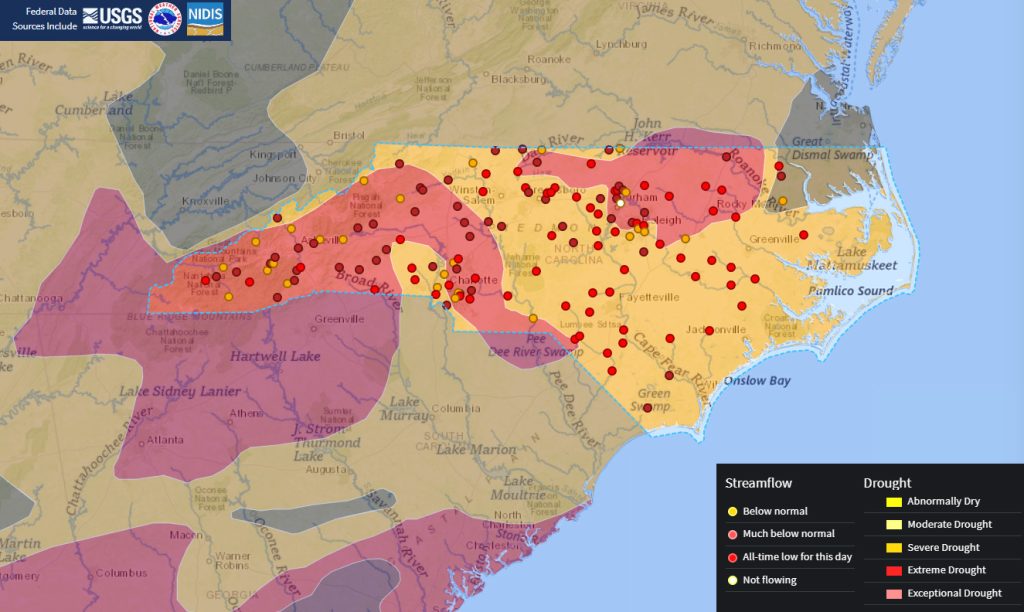 Streamflows are at record lows for this time of year at nearly all USGS monitoring gauges statewide. Among the state’s 85 drought indicator wells, 20 are now at record low monthly levels, spanning from Bryson City in the west to Elizabeth City in the east. Water restrictions have gone into effect in several communities. Raleigh has implemented mandatory once-per-week outdoor watering limits, Rocky Mount is requesting voluntary conservation, and Charlotte Water has also asked residents to conserve voluntarily.